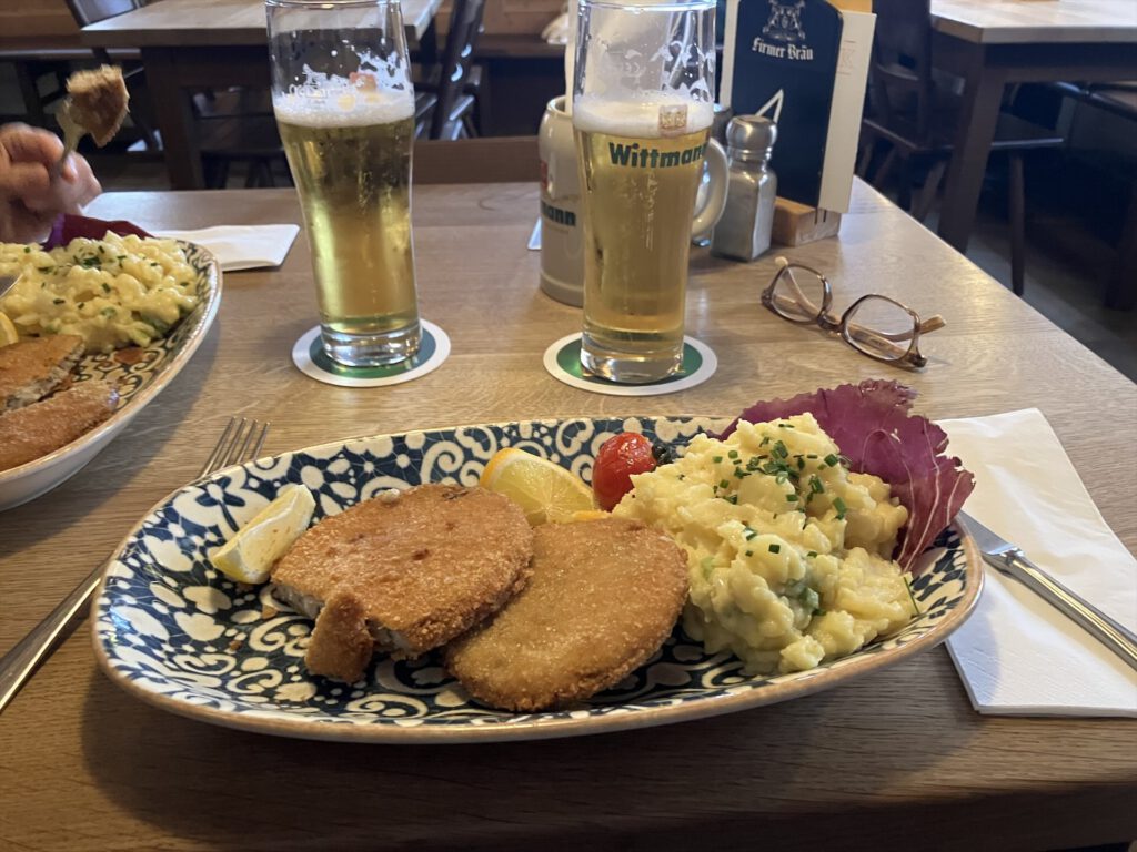 Wir kamen gegen 16:00 Uhr an und konnten auf dem großen Festplatz an der Isar und nahe der Innenstadt über Nacht stehen bleiben. Landshut war mir bisher völlig unbekannt, Rainer hat dort einen Teil seines Wehrdienstes abgeleistet. Von der Kaserne ist nicht mehr viel zu sehen. Wir haben die auffälligen Giebelhäuser der Stadt besichtigt und uns ein bayrisches Brot gekauft. Anschließend gab’s noch gebackene Milzwurst beim Firmerbräu, war gut aber nur gebraten ohne Panade wäre es wahrscheinlich noch besser gewesen.