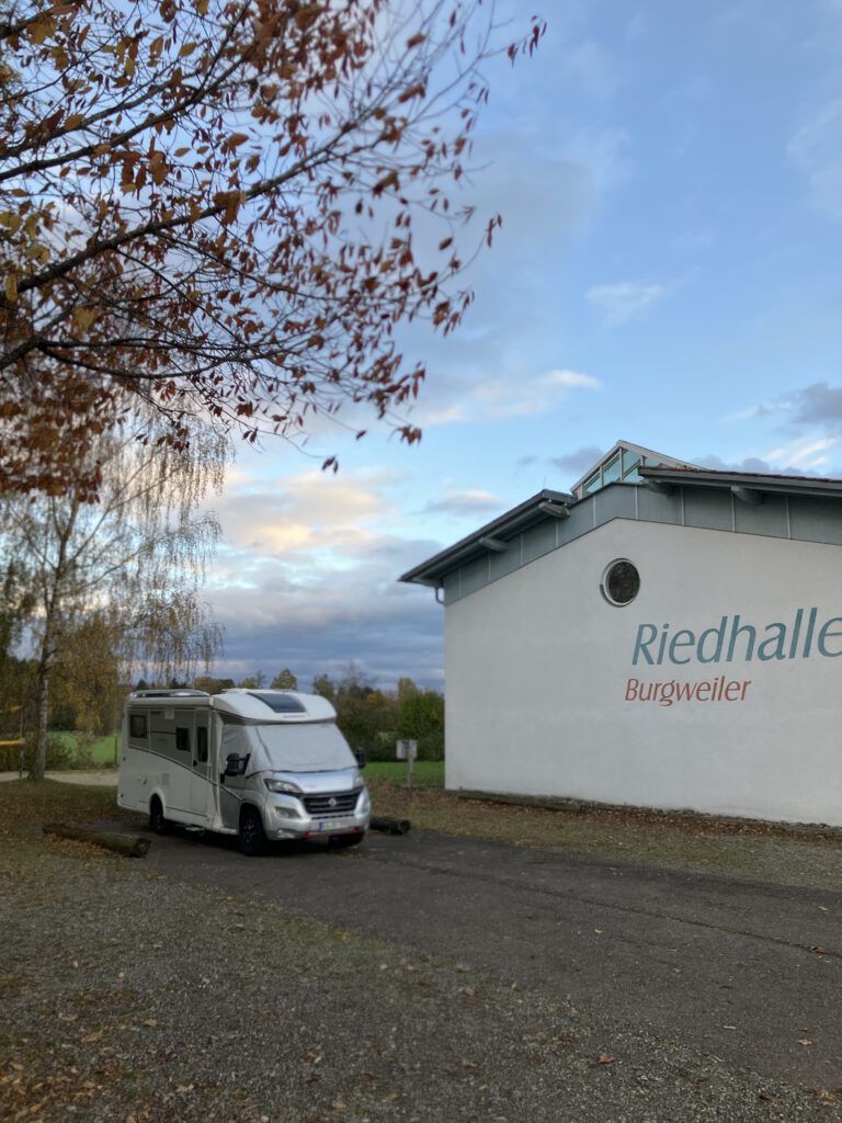 Hier ist es deutlich hügeliger als gedacht. Wir erreichen Höhen von über 700 Meter. Ein Baustelle zwingt uns zu einer Umleitung, so dass wir auf einen WoMo-Stellplatz in dem kleinen Ort Burgweiler bei Ostrach landen. Direkt neben einer Sporthalle. Es ist einsam und ruhig. Wir sind froh, dass wir den Parkplatz am Bodensee verlassen haben.